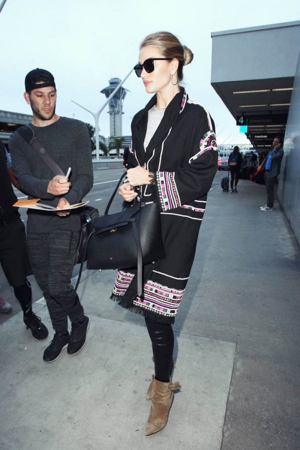 The Victoria's Secret Angel donned black leather skintight pants that she paired with grey T-shirt, while she gave her casual look a smart twist with black jacket that featured multicolored panels. Rosie rocked a pair of tan ankle length suede booties, and carried a trendy leather handbag.