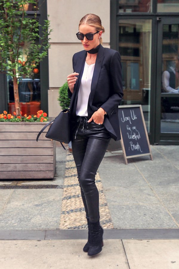 The Victoria's Secret Angel put her long legs on display in black leather super skinny pants which she paired with white top that she tucked into her pants. She wore a black blazer, and gave her slender legs extra length with black Alaïa embroidered suede boots. Rosie looked so chic!