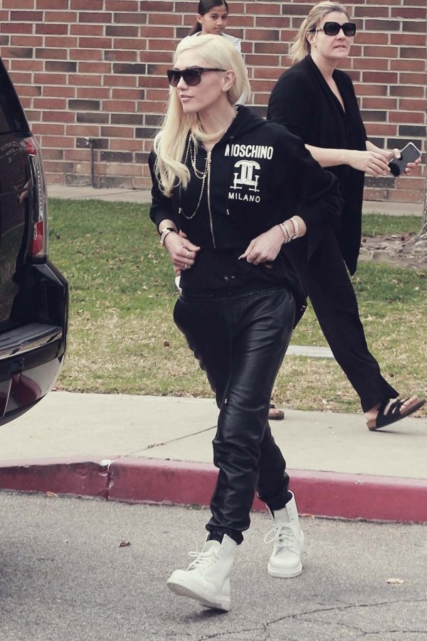 Gwen was wearing black leather pants that she teamed with matching hoodie that she wore over a black ripped T-shirt. She slipped her feet into a pair of white boots, while she gave her casual look a stylish twist with gold jewellery that included a stack of bracelets and a multi-chain necklace.