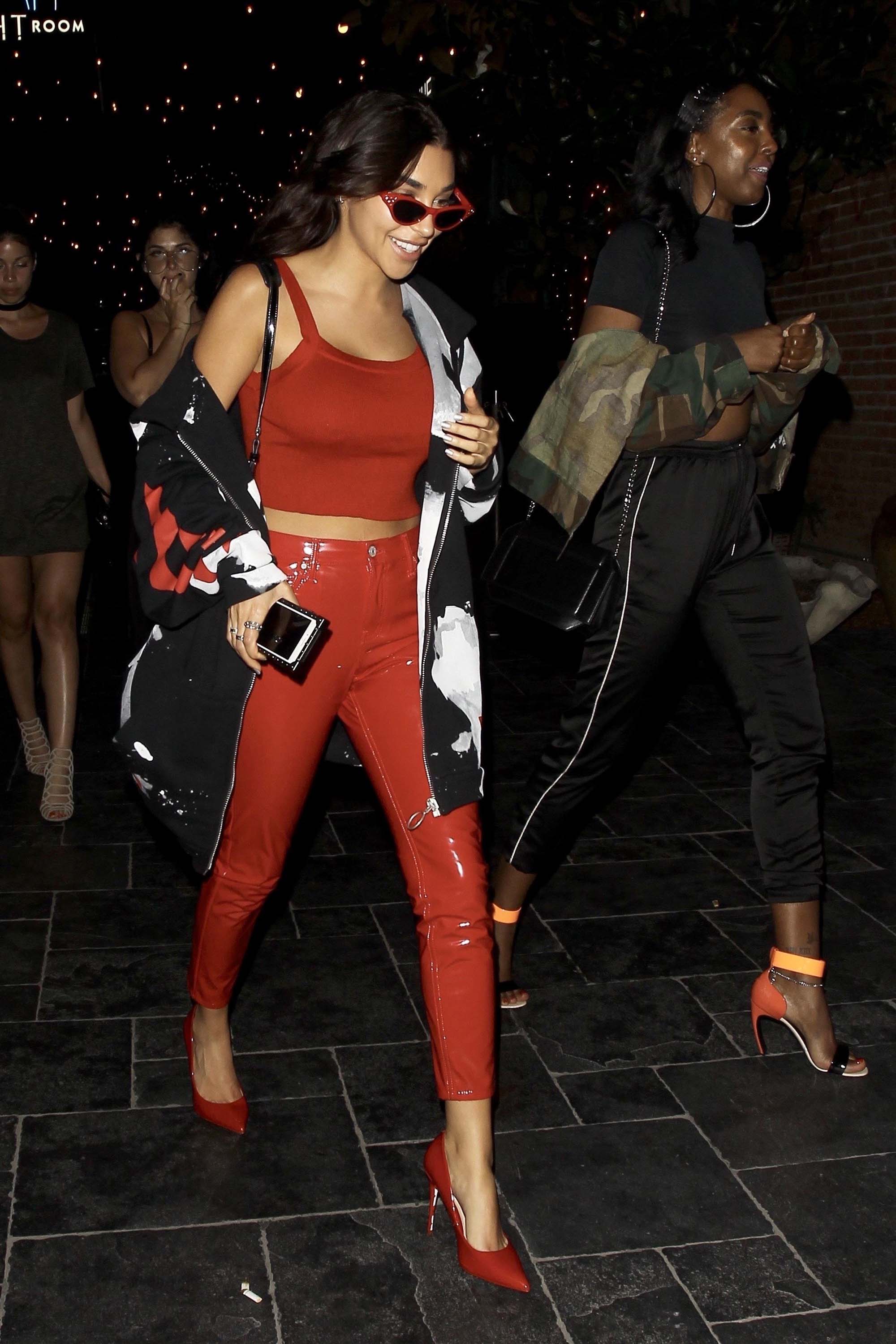 Chantel Jeffries smiles and poses for photos in a red hot form fitting outfit