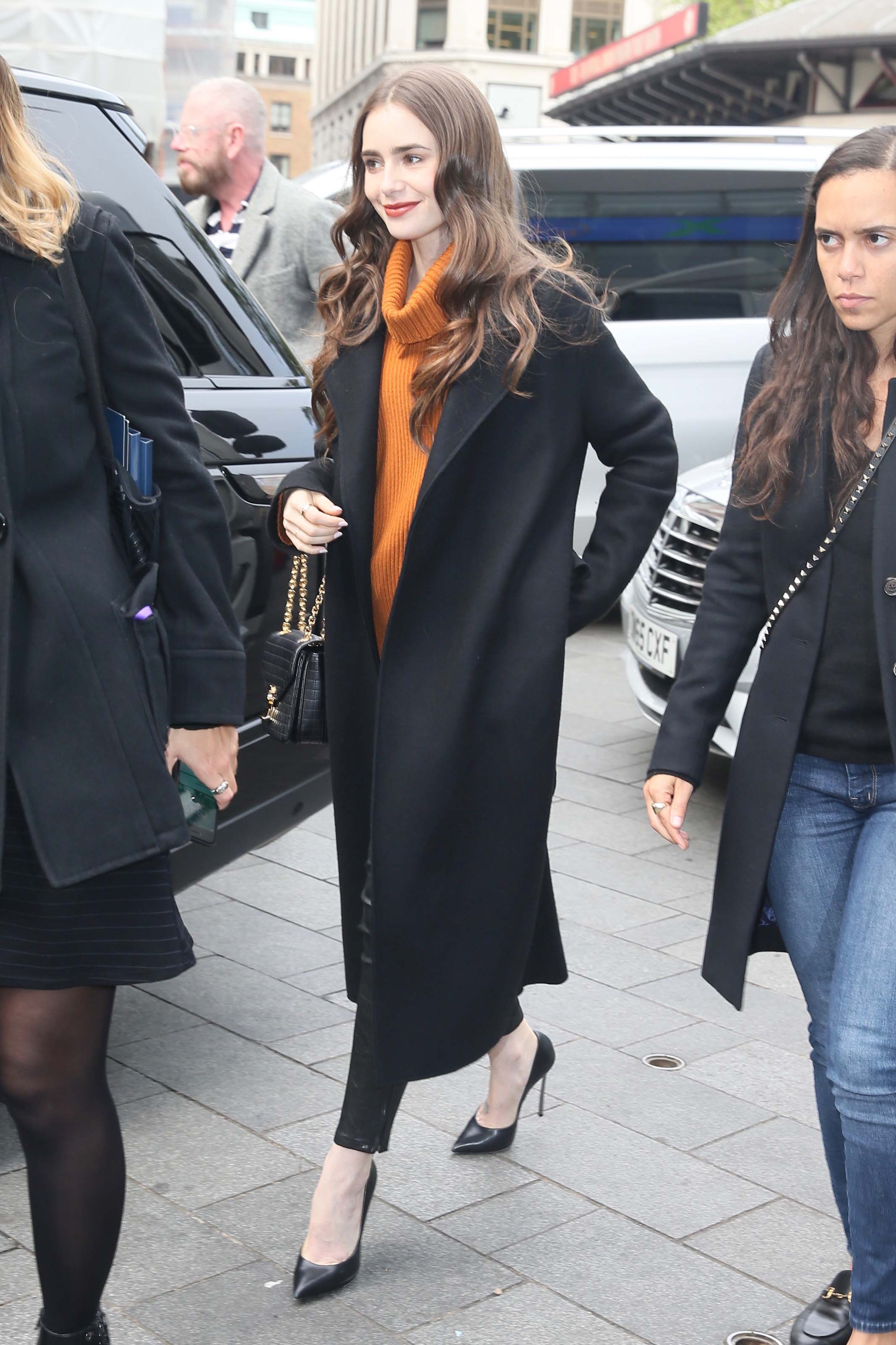 Lily Collins seen arriving at Global studios for radio interviews in London, 04/29/2019
