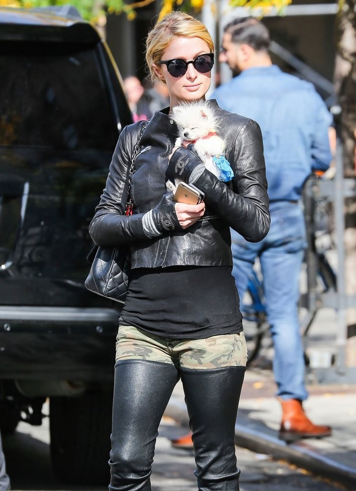 Paris Hilton seen with her dog waiting for a cab